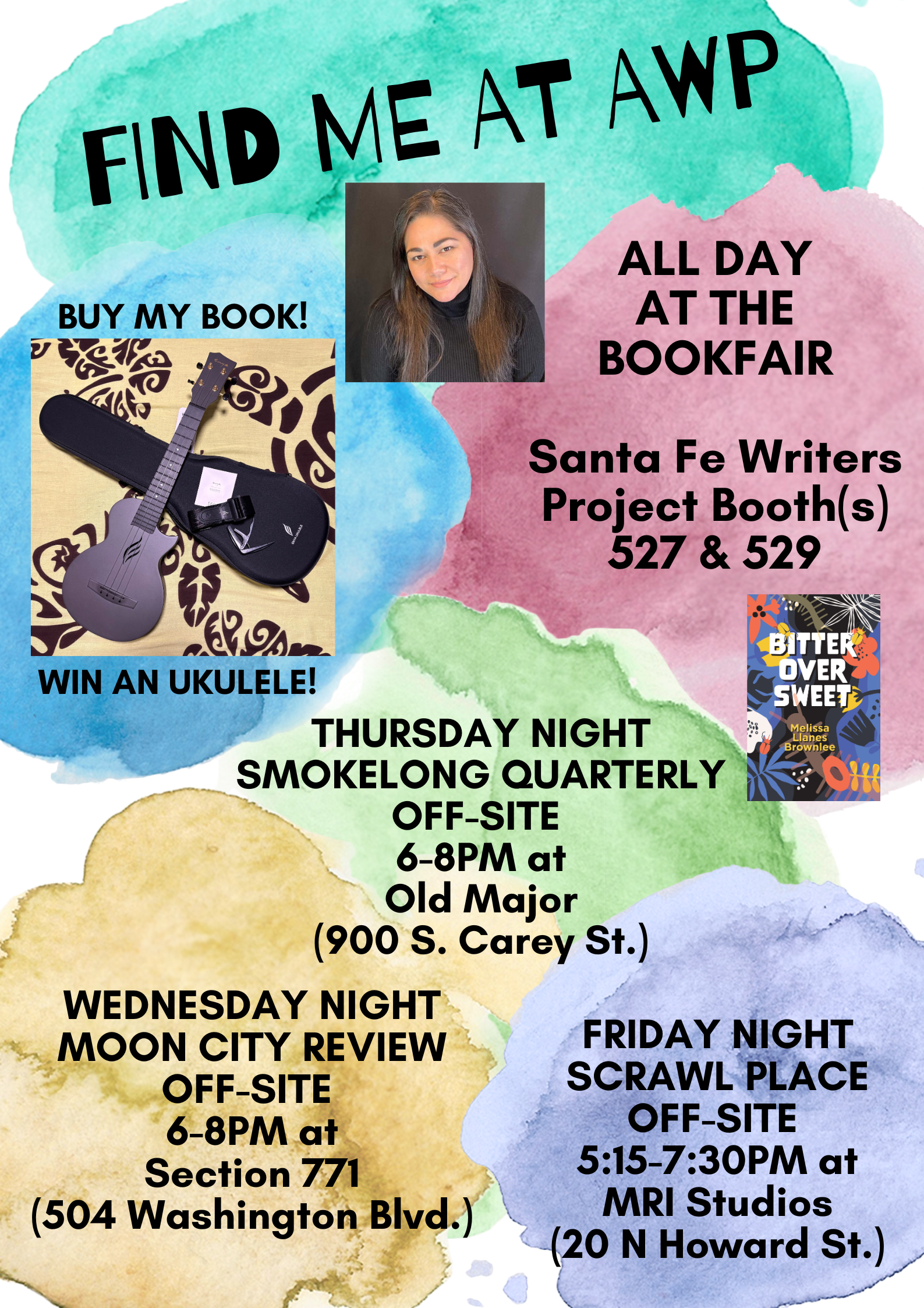 If you buy a copy of Bitter Over Sweet at Santa Fe Writers Project (Booths 527 and 529), you could win an ukulele and lessons via Zoom with me!
